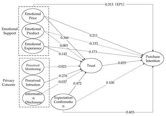 We did the mediating test with Amos25, using 2500 resampling bootstrapping and the results are shown in Table 6. The indirect effects of emotional price on purchase intention via the trust are significant , and the direct effects of emotional price on purchase intention are not significant , which means that trust fully mediates the effect of emotional price on purchase intention. Thus, H6a is supported. The indirect effects of emotional products and emotional experience on purchase intention via the trust are not significant, which suggests they have no mediation effect. Thus, H6b and H6c are not supported. The indirect effects of expectation confirmation on purchase intention via trust are significant , and the direct effects of expectation confirmation on purchase intention are not significant , which means that trust fully mediates the effect of expectation confirmation on purchase intention. Thus, H8 is verified.