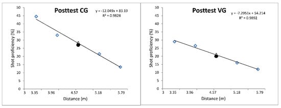 Posttest average shot proficiency across the 3.35, 3.96, 4.57, 5.18, and 5.79 m distances from the basket. The non-filled triangles illustrate the expected shot proficiency values at the 4.57 m distance, based on linear regression. Filled black circles represent real values (shot proficiency) at a distance of 4.57 m from the basket. The non-filled diamonds represent mean shot efficiencies at all distances but 4.57 m.