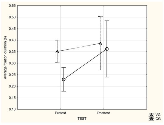 We did not find any significant (p > 0.05) differences in the analysis of average gaze duration. A two-way repeated measure ANOVA (F(1, 17) = 1.42, p = 0.25) yielded insignificant main effects (CG vs. VG; pretest vs. posttest) and interaction effects (group × test) (Table 6). The average gaze duration increased insignificantly in posttests in both groups compared to the pretest (Table 7). The changes between the pre- and posttest in both groups are depicted in Figure 2 and the individual average gaze durations in Figure 3.