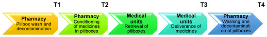 This study was an observational study. During a one-day period, study investigators collected data on the same pillbox. Each observer conducted 20 h of observations between the hours of 5:00 and 23:30 from the medication cabinet to the wash service. Pillboxes were randomly selected from all the medical prescriptions received the previous night before midnight in the pharmaceutical service. Using a standardized form for each pillbox, investigators recorded the date, start, and end time of the observation period. Observers classified each pillbox entering the drug distribution circuit into one of the following four periods: (i) after decontamination (T1 sample); (ii) after use for medicine preparation in the pharmacy (T2 sample); (iii) upon return from the medical unit (T3 sample) and (iv) after washing in the dishwasher (T4 sample).