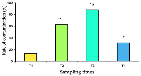 The contamination rates are presented in Figure 2. After scrupulous washing (T1 samples), the pillbox contamination rate was relatively low (13%). Contamination significantly increased after use in the pharmacy (T2 samples: 63%, p = 0.001 vs. T1) and again after use in the medical units (T3 samples: 88%, p < 0.05 vs. T2, p < 0.001 vs. T1). After washing in the dishwasher, the contamination rate decreased dramatically (T4 samples: 31%, p < 0.001 vs. T3) to a value that was not significantly different from baseline.