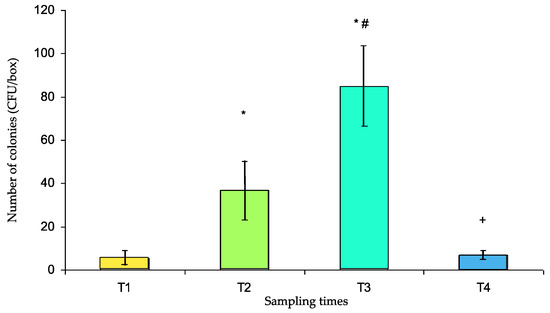 Number of colony forming units (CFUs) per box (mean ± s.e.m.) at different sampling times (T1 to T4). T1: after cleaning, T2: after use for medicine preparation in the pharmacy, T3: upon return from the medical unit, T4: after washing in the dishwasher. * p < 0.001 vs. T1, # p < 0.001 vs. T2, + p < 0.001 vs. T3.