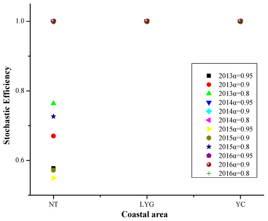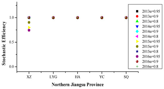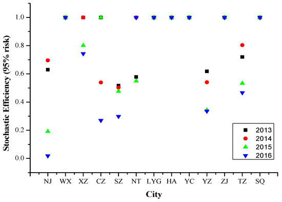 Referring to Figure 1, at a 95% risk level, Wuxi, Lianyungang, Huai’an, Yancheng, Zhenjiang and Suqian were the cities with stochastic DEA efficiency from 2013 to 2016. It indicates that the prevention and control of PM2.5 pollutions in these cities was relatively effective in recent years.