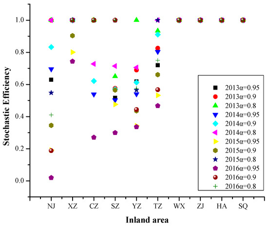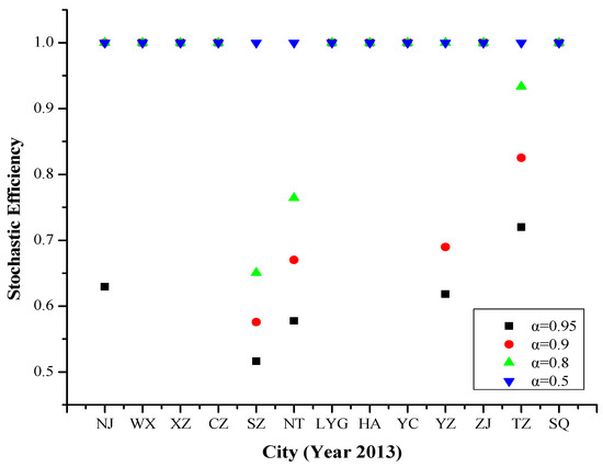 Before the result analysis, it should be noted that the analysis process is like the evaluation results obtained from 2013 to 2016. In view of space constraint, this study took 2013 as an example to give detailed analysis process and conclusions on stochastic DEA results of 13 cities. For the assessment results from 2014 to 2016, this study only provided a comprehensive conclusion. In addition, the random efficiency values obtained from 2014 to 2016 were shown in Appendix A, Table A2, Table A3, Table A4, Table A5, Table A6 and Table A7.