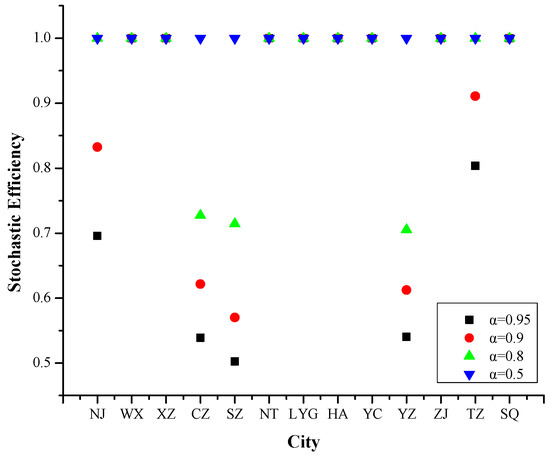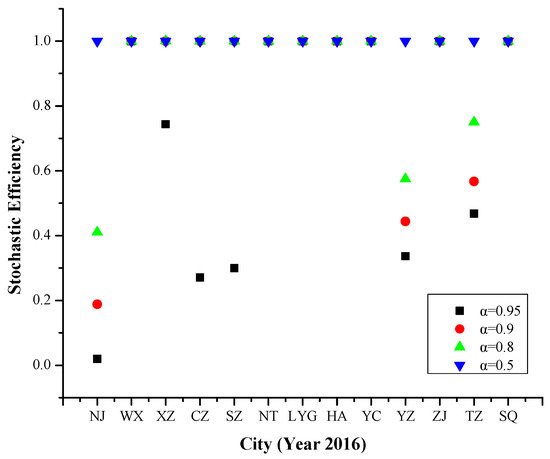 Stochastic efficiency values of 13 cities in Jiangsu Province at different risk levels in 2016.
