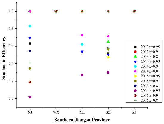 Stochastic efficiency values in southern Jiangsu Province at different risk levels in 2013–2016.