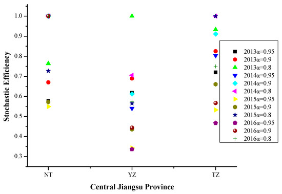 At the 95% risk level, the efficiency values of Wuxi, Xuzhou, Changzhou, Lianyungang, Huai’an, Yancheng, Zhenjiang and Suqian were 1, and the remaining cities were ranked by efficiency values (from high to low) as follows Taizhou, Nanjing, Yangzhou, Nantong and Suzhou. But at 50% risk level or less, the efficiency values of all 13 cities were 1.