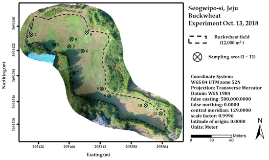 A field experiment was conducted during the 2018 growing season in a buckwheat field (33.33° N, 126.80° E) located in Sehwa-ri, Seogwipo-si, Jeju, Republic of Korea (Figure 1). Seeds of buckwheat cultivar (120 kg·ha−1), Dasan, were scattered to be sown on 27 August 2018. The whole field size is around 12,000 m2. Before sowing, tillage was executed twice to prepare the field on 14 and 21 August 2018. Fertilizer (nitrogen:phosphorus:potassium = 21:17:17) of 300 kg·ha−1 was applied on 21 August 2018.