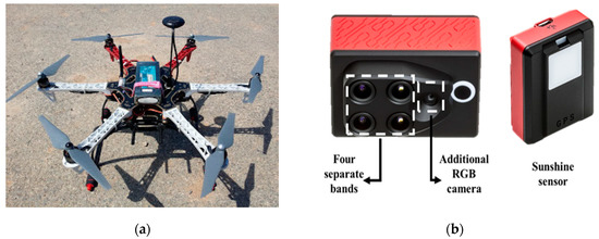 Views of (a) the manufactured unmanned aerial vehicle and (b) the commercial multi-spectral camera with sunshine sensor.