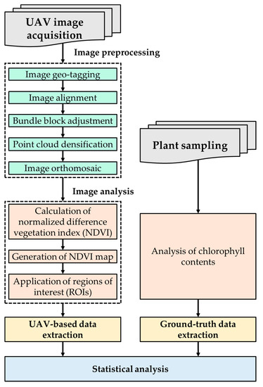 Figure 3 shows the flow chart of the image preprocessing and analysis steps, including image orthomosaic, calculation of the NDVI, and statistical analysis. The Pix4Dmapper Pro 3.0.17 was used to process the collected multi-spectral and RGB images and corresponding orthomosaics. As such, an image geo-tagging process, that inserts the geographical information in the UAV-based images, is needed prior to initiating the software workflow for image orthomosaic. In the case of the used camera, GPS and IMU are built in, so flight position and attitude information is automatically recorded and geo-tagged to the collected images. After the geo-tagging process, the image processing workflow is composed of two main stages: (i) image alignment and feature points extraction; and (ii) orthomosaic generation.