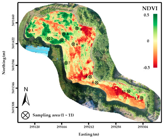 Field maps with RGB and NDVI data were generated (Figure 5). Vegetative area shown as the green color in the RGB map was well matched with the NDVI considering the typical value of the NDVI ranges from 0.1 to 0.6 [17]. Since this field was severely damaged by typhoon KONG-REY, on 7 October 2018, bare soils were exposed and are expressed as the red color.
