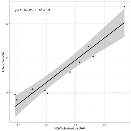 Simple linear regression analysis for comparison of the normalized difference vegetation index (NDVI) value determined by the unmanned aerial vehicle (UAV)-based image and ground truth chlorophyll content (μg·mL−1) from 11 sample sites. Shadow indicates 95% confident interval.