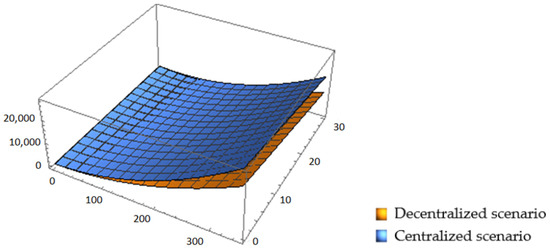 Figure 7 show that the recycling amount of C&D waste increases with an increase of ε. Compared with the decentralized scenario, the recycling amount in the centralized scenario is obviously higher, and also increases at a steeper rate. This shows that cooperation among the supply chain members leads to a growth in the recycling amount and to more sustainability, which once again proves the high efficiency of the centralized scenario.