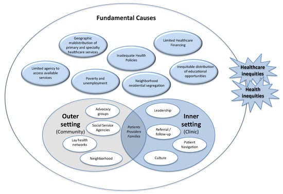 - Gehlert, S.; Sohmer, D.; Sacks, T.; Mininger, C.; McClintock, M.; Olopade, O. Targeting health disparities: A model linking upstream determinants to downstream interventions. Heal. Aff. 2008, 27, 339–349. [Google Scholar] [CrossRef]