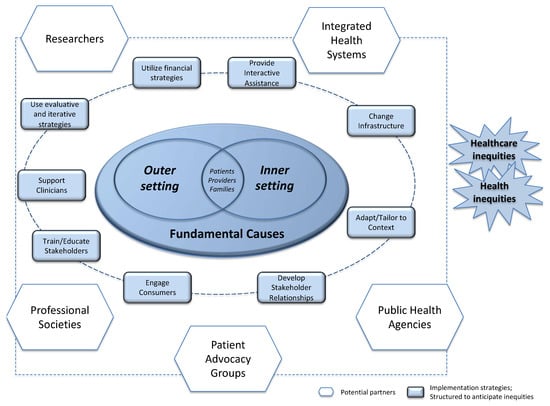 Framework merging implementation science arenas, stakeholders, and strategies with insights from social scientific research on health inequities. Like other implementation science frameworks, we place patients, providers, and families at the center of the action, and show that their healthcare seeking behaviors are affected by—and potentially limited by—factors in the inner clinic setting and outer clinic setting. We also show, however, that fundamental causes of disease (e.g., poverty, racism, structural inequalities) exert their influence. The heavy dashed line connects the nine major categories of implementation science strategies identified by the ERIC study [63,64]. The lighter dashed line connects the stakeholders who should play a role in dissemination and implementation efforts. Any of the nine categories of implementation science strategies identified by the ERIC study could be used by any of the stakeholders; indeed, an effective implementation may require the involvement of multiple stakeholders, each bringing their skills to the project.