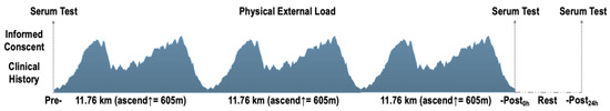 Participants were assessed -pre (serum test), during (physical external workload), -post0h (serum test) and -post24h (serum test) a trail running event. Participants were asked to run 3 × 11.76 km trail circuit (total distance: ~35.27 km, cumulative positive ascend: 1815 m [from 906 to 1178 m.a.s.l.]). The altimetry of the event and variables with its measurement time can be assessed at Figure 1. The thermal stress index (WetBulb-Globe Temperature [WBGT]) registered throughout the event was 23.2 ± 1.8 °C (temperature: 24.46 ± 2.42 °C and humidity 77.88 ± 10.91%) according to the WBGT (QuestTemp 36, 3M, MN, USA). Final running time was 290.3 ± 54.2 min.