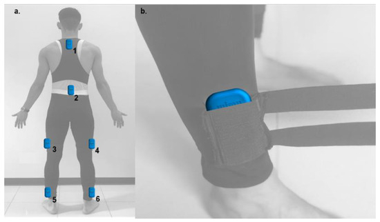 IMU device’s setting (a) 1: T2–T4, 2: L1–L3, 3: VLleft and 4: VLright vastus lateralis, 5: MPleft and 6: MPright malleolus peroneus; (b). body attachment anti-vibration straps system.