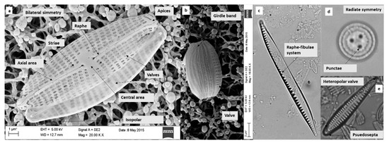 Main features of the valves visible under SEM: pennate diatom frustule in the valve view (a) and girdle view (b) with the main features of the valves; and under light microscopy: pennate diatom (c,e) and centric diatom (d).