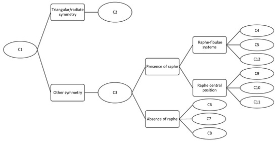The FC allows the user to arrive at the genus and species starting with an image and measurements. For example, for the pennate diatom in Figure 1a with “other symmetry”, the raphe in central position would lead (after C1 and C3) to one of C9, C10 or C11 according to other distinctive characters. Instead, for the centric diatom (Figure 1d), the radiate symmetry would lead to C2. The genus or family levels described in each chart are reported in Table 1.