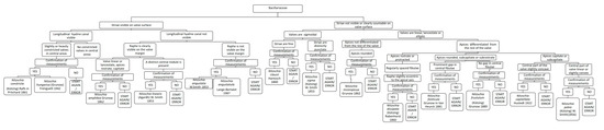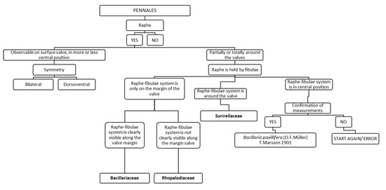 Chart C3 introduces the user to the genera of Pennales (Figure 5). The description of the raphe, observable on the surface of the valve approximately in a central position or observable partially or totally around the valve and held by fibulae, leads either to a second step referring to bilateral or dorsoventral symmetry of the valve, or to a second step referring to the position of the raphe–fibulae system. After the choice of the latter, if the raphe is all around the valve the diatom is a Surirellaceae, if it is in a central position the diatom is identified as Bacillaria paxillifera. Instead if the raphe–fibulae system is clearly visible or not on the margin of the valve, the diatom will belong respectively to Bacillariaceae or Rhopalodiaceae.