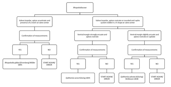Chart C4 describes three species of Rhopalodiaceae (Figure 6). The first step describes “valves isopolar, apices acuminate and presence of a notch at valve center” or “valves isopolar, apices rostrate or rounded and raphe–fibulae system visible in a V shape at valve center”. The former leads to Rhopalodia gibba. The latter leads to a step referring to ventral valve margin strongly arcuate and apices rostrate or to ventral margin slightly arcuate and apices rostrate or capitate. In the first case it leads to the identification of Epithemia sorex, in the second case to Epithemia adnata.