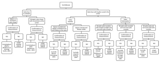 The charts present a common last step: “confirmation of measurements”, i.e., width, breadth and number of striae. The Rapid Method for Identification of Italian Diatom Species has a dataset containing all the measurements of diatom species; confirmation of the measurements is performed by comparing observed measurements with those reported in the dataset. Whenever the measurements do not match, the process should restart from the beginning of the FC.