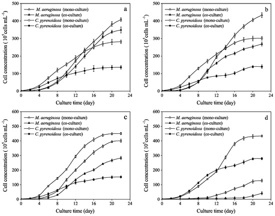 Growth curves of M. aeruginosa and C.pyrenoidosa in mono-cultures and co-cultures under different treatments of phenol: (a) 0 μg mL−1, (b) 2 μg mL−1, (c) 20 μg mL−1, and (d) 200 μg mL−1.