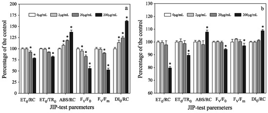 Changes in JIP-test parameters (compared to the control of the same species, and displayed as the percentage of the control) at different concentrations of phenol: (a) M. aeruginosa and (b) C. pyrenoidosa. The significant difference compared to the control is indicated as * (p < 0.05).