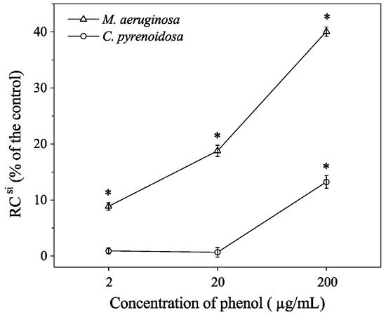 Growth curves of M. aeruginosa and C. pyrenoidosa in mono- and co-cultures are displayed in Figure 1. In mono-cultures, the growth of M. aeruginosa was markedly inhibited by high concentration (200 μg mL−1) of phenol in the beginning (Figure 1d), while the cell concentration of C. pyrenoidosa increased by 61% and 54% in 20 and 200 μg mL−1 treatment groups, respectively (Figure 1c,d). Growth hormesis was observed in some algae after exposure to chemicals, based on the findings of previous studies that conducted the dose-response experiments [12,32]. Hormesis is a term for the stimulatory effects caused by a low concentration of the toxic agent. Hormesis phenomenon in M. aeruginosa was also observed in this study at low concentrations of phenol, but it exhibited a dose-response effect when phenolic concentration increased, showing a significant inhibition in growth rate. However, C. pyrenoidosa grew well despite the increase in phenolic concentration. The ecotoxicity of phenol occurs from the damage to cell membranes via hydrophobic interaction with lipid bilayer structures [33], and phenol could also penetrate cells and damage inner systems, such as endoplasmic reticulum, nuclei, and their components [10]. Moreover, the reactivity of phenol with biomolecules is related to the ease with which it donates free electrons to oxidized substrates and the oxidative stress caused by free radicals and reactive oxygen species (ROS), such as superoxide radicals or hydrogen peroxide [10].
