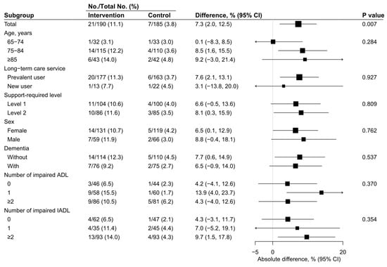 There were no missing data for the primary outcome and serious adverse events. Significant difference was observed in the incidence proportions of independence from long-term care services between participants who received the CoMMIT program or standard care alone in the ITT, FAS, and PPS populations. In the ITT population, the incidence proportions of independence were 11.1% in the intervention group and 3.8% in the control group (absolute difference: 7.3; 95% CI: 2.0–12.5; Figure 3). In the FAS and PPS populations, similar results were observed (Figure S2; Figure S3). Further, a much higher incidence proportion ratio was observed in the FAS population than in the ITT population (incidence proportion ratio: 19.7 for FAS vs. 2.5 for ITT), although the FAS and PPS populations showed similar ratios (incidence proportion ratio: 19.7 for FAS vs. 18.7 for PPS). The tests for interaction for exploratory subgroup analyses did not find any statistically significant difference in any of the subgroup categories. In addition, there was no difference in the risk of serious adverse events between the groups in the ITT, FAS, and PPS populations (Table 2).