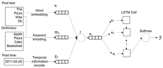 The proposed model is derived from a long short-term memory network (LSTM) [], and we name it ALSTM (activity LSTM). Its architecture is shown in Figure 1 and consists of four main components: word embedding, dictionary knowledge encoding, temporal information encoding, and a long short-term memory network.
