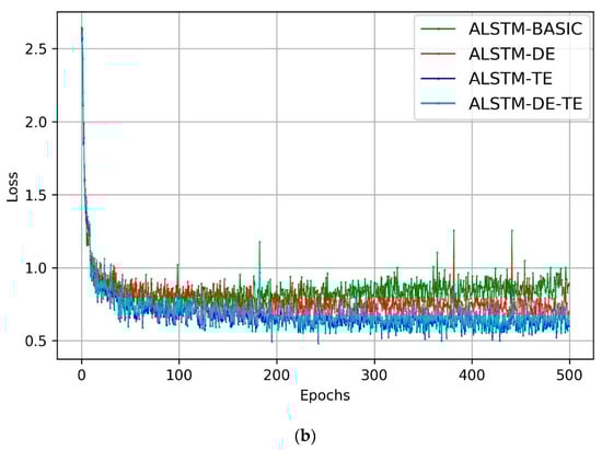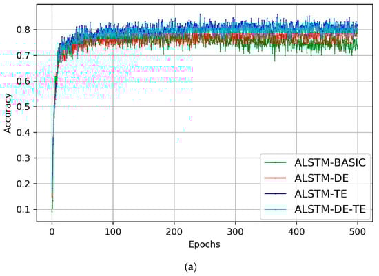 We calculated the accuracy rate and loss when the models were trained. The accuracy rate and loss curve of the four ALSTM variants are shown in Figure 2. As shown in Figure 2a, the accuracy of all the models increased first, reaching a higher accuracy rate and maintaining relative stability after approximately 80 epochs. From Figure 2b, we can see that the loss of all four models decreased quickly in the first 50 epochs and slightly fluctuated in the last training process. Both Figure 2a,b show that the ALSTM-TE performed best with higher accuracy and lower loss value.