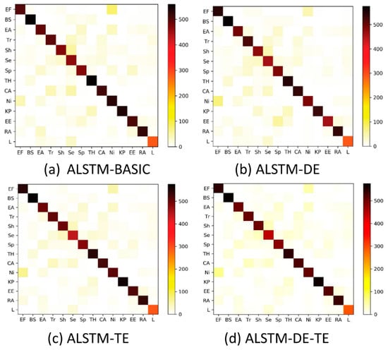 Figure 3 also shows that the ALSTM-DE-TE model performed the best for dealing with category confusion, although its overall accuracy was slightly lower than that of the ALSTM-TE model. We believe that the ALSTM-DE-TE model may perform better in other datasets.