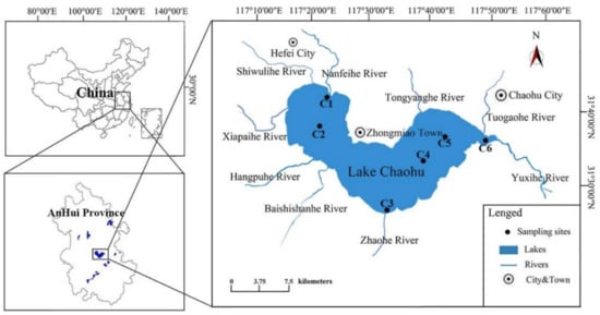 To summarize the overall situation of the lake, we selected three sampling points: the estuary of the Nanfei River (C1: 31°41′26″N, 117°24′1″E), the Yuxi River (C6: 31°35′33″N, 117°48′13″E) and the Zhaohe River (C3: 31°26′3″N, 117°33′4″E). C2 (31°37′59″N, 117°22′43″E) and C5 (31°35′38″N, 117°41′43″E) were located in the center of East Lake and West Lake, respectively. C4 (31°31′14″N, 117°37′38″E) was located in the Lake Chaohu source of drinking water. The average sedimentation rate of the 210 Pb dating method in Lake Chaohu was 0.25 cm/a []. We collected 24 samples from the six sites in four seasons (summer: August 2016, autumn: November 2016, winter: February 2017, and spring: May 2017). Sample name was abbreviated. For example, CSM1 to CSM6 represent samples of sediments from C1 to C6 at the Lake Chaohu sampling site in May, where C represents Lake Chaohu, S represents sediment, and M represents May.