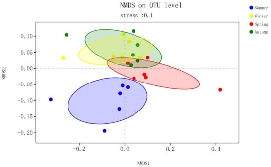 A Bray–Curtis distance matrix was analyzed with NMDS to explore the beta diversity of all samples. The horizontal and vertical coordinates of the NMDS plot indicate relative distances and have no practical significance. The bacterial communities of the sediments displayed distinct seasonal groups (Figure 2). In contrast, the NMDS plot demonstrated very inconspicuous spatial groups. The consistency of the results was verified using Bray–Curtis dissimilarities based on ANOSIM statistics (Table 1). Season (r = 0.319, P = 0.001) had a more significant effect on the sediment bacterial community than space (r = −0.083, P = 0.929).