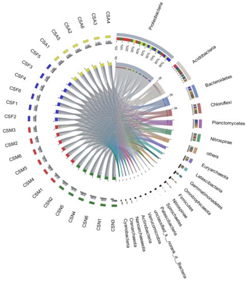 Distribution of the microbial community for each sample at the phylum level. Circos [] visualized the data. The width of the bars for each phylum indicates the relative abundance of the phylum in the sample. CS indicates the sediments of Lake Chaohu, A (August), F (February), M (May) and N (November) indicate four months, and 1 to 6 indicate sampling points C1 to C6.