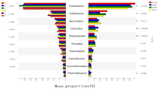 Significantly different relative abundances among seasons and point groups. One-way analysis of variance (ANOVA) was used to evaluate the importance of comparisons between indicated groups. * P < 0.05, ** P < 0.01.