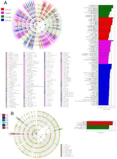 Groups were represented by a cladogram, and LDA scores of 2 or greater were confirmed by LEfSe analysis (Figure 5B). The cladogram revealed that 8 phyla, 16 classes, 31 orders, 34 families, and 42 genera showed significant seasonal variation (Figure 5A) (Table 2). Many groups of bacteria were significantly enriched. For example, Acidobacteria (from phylum to genus) was prominent in the spring, Verrucomicrobia and Actinobacteria (from phylum to genus) were significantly enriched in summer, and Planctomycetes (from phylum to genus) was enriched in winter. Among the groups that showed the strongest seasonal changes, most had the highest abundance in winter (Table 2). However, in the spatial groupings, fewer microbes were significantly enriched: Nitrospinae (from phylum to genus), Rokubacteriales (from order to genus) and B1 7BS (the family and its genus).