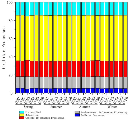 Although we found changes in the bacterial community among seasons and sites, no significant differences in their functional spectra were observed. Analysis of the community KO profiles demonstrated no significant differences in functional groups, regardless of sample location or time interval (Figure 6). Most functional genes were involved in metabolic function (~49.5%), followed by genetic information processing (~17%).