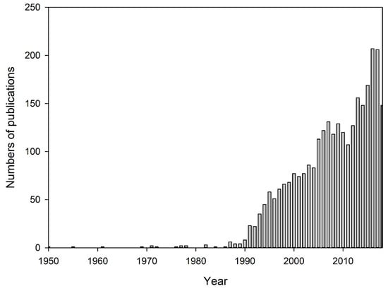 To give an overview of research in groundwater remediation, the annual number of articles published from 1950 to 2018 (total, 2867) is shown in Figure 1. In 1950, only one article, titled “Ground-Water Pollution in Michigan”, was published []. Subsequently, the annual number of publications was fewer than 10 until 1990. The number of articles increased significantly after this period, from 23 in 1991 to 207 in 2016.