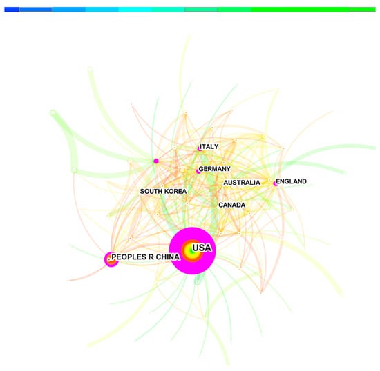 To date, CiteSpace has been employed in studies of, for example, nonpoint source pollution [], information sciences [], psychological science [], and global green innovation []. In this study, we produced and analyzed co-occurrence networks of subject categories and countries, and co-citation networks of journals, authors, and references using CiteSpace.