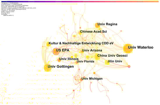 The top 10 research institutions issued 455 articles, accounting for 15.9% of the total. According to Table 1 and Figure 3, the first major research echelon was led by the University of Waterloo, where hydrologists first used zero-valent iron (Fe0) to treat contaminated groundwater in situ approximately three decades ago [,]. Of these top 10 institutions, three were in the U.S. and three in China, confirming that the U.S., Canada, and China have considerable capabilities in groundwater remediation research, and strong expertise in research and development.