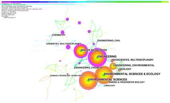 Based on co-occurrence analyses of subject category, the disciplines involved in groundwater remediation can be detected. In this study, we selected the top 30 subject categories with the largest number of reoccurrences each year for category characteristic analysis. The information on subject categories was extracted from the SCI-E databases using CiteSpace and analyzed. Figure 4 shows the co-occurrence network from 1950 to 2018, where one node represents a subject category, and the edge connecting two nodes represents the co-occurrence of two subject categories. The top three popular research categories were environmental sciences and ecology, environmental sciences, and engineering. Of the top 10 subject categories, engineering had the central position and played an important role in groundwater remediation. Material science was second, followed by water resources, and chemistry, physical. Therefore, groundwater remediation is a multidisciplinary research field, involving an extensive range of interests.