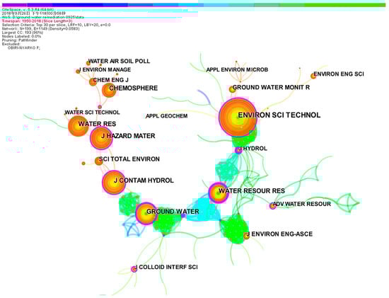 “Core journals” usually refer to top-ranking journals with high citation frequencies. We produced a groundwater remediation journal co-citation map with 199 nodes and 1149 links, using CiteSpace software (Figure 5). The top 10 most productive journals, with >500 citations, are listed in Table 2. The total of 12,090 citations from the 10 journals accounts for 34.74% of the total citation count. Thus, the citation distribution was concentrated. In addition, these 10 journals were defined as the “core journals” in the field of groundwater remediation.