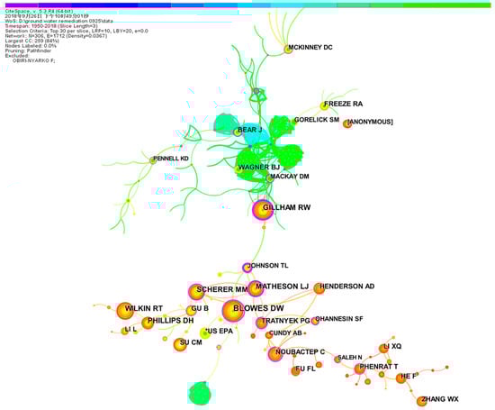 The largest node corresponded to Blowes DW, whose articles were cited 251 times; this was followed by Gillham RW (233), Wilkin RT (204), Matheson LJ (190), Scherer MM (177), Phillips DH (165), Su CM (157), and Noubactep C (145). Thus, these authors’ works had a marked impact on groundwater remediation research and development, and they represent the core research strength in the field.