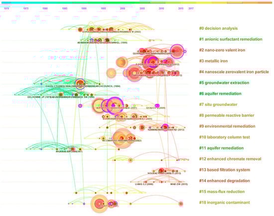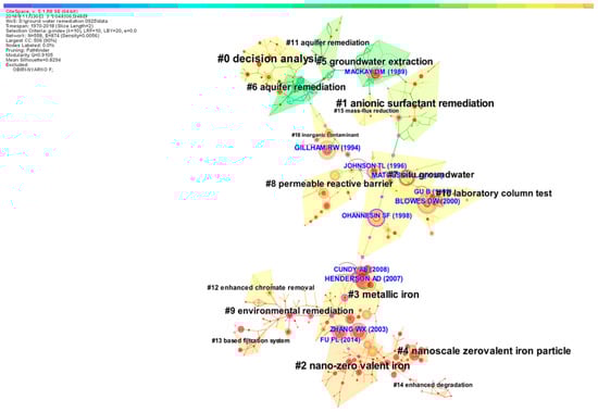 The most‑cited articles are generally considered landmarks, owing to their ground‑breaking contributions []. Cluster #7 had three of the top 10 landmark articles, and Clusters #3 and #10 each had two (Table 4). The most-cited articles in the databases were by Blowes (2000), with 154 citations, followed by Gillham (1994), with 144 citations and Matheson (1994), with 135 citations, and the most recent was a review article by Fu (2014). Interestingly, the titles of the most‑cited articles contained the terms “permeable reactive barriers”, “zero-valent iron”, “nanoscale iron particles” (Table 4), which were in accordance with the research fronts noted above.