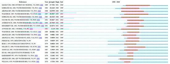 A reference citation burst may indicate an emergent research front, and the citation-burst-detection algorithm of Kleinberg [] is adapted for identifying emergent research front concepts. Table 6 lists the references that had the strongest metric of citation bursts across the entire database during the period 1950–2018. Among the articles with strong citation bursts (Table 6 and Figure 9), Mackay and Cherry [] is worthy of note. Their article explored the reasons for the difficulty of groundwater clean-up, noted some implications, and suggested that achieving stringent health-based clean-up standards is unlikely, and the ultimate cost of clean-up is high in many cases. Thus, they suggested that site characterization and remediation have much room for improvement, by both the development of new tools and ongoing training of staff []. Subsequently, the development of permeable reactive barrier technology using zero-valence iron filings has proceeded from recognition, evaluation, technology conceptualization, and proof of concept, to commercialization.
