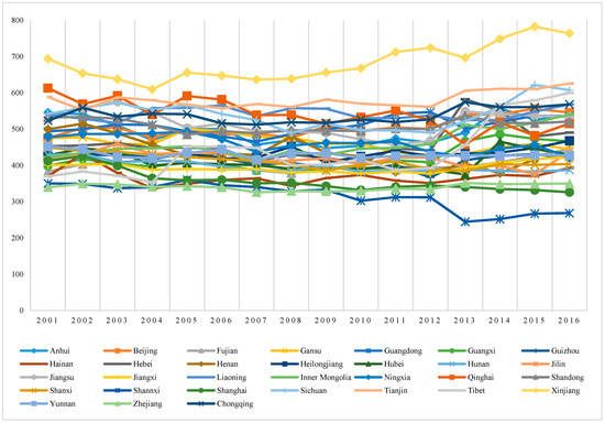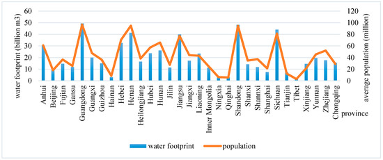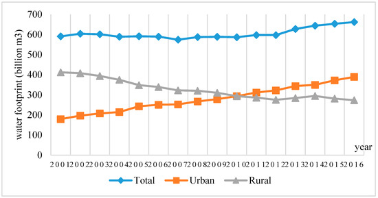 In China’s statistical yearbook and provincial statistical yearbook, there are detailed records of residents’ consumption, such as the annual consumption of different food for each person in urban and rural areas. In this study, data from 2001 to 2016 were used for a diachronic analysis, and the missing data were calculated by using the existing data. The per capita food consumption and water footprint of urban and rural residents in each province multiplied by the population of urban and rural residents is the annual food consumption and water footprint of the urban and rural population in each province. We did not calculate the imported agricultural products, because the yerbooks did not distinguish where the food came from. Moreover, the imported agricultural products were mainly used as feed grain and industrial grain.