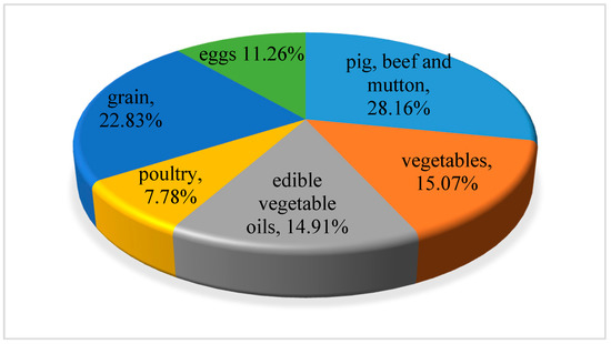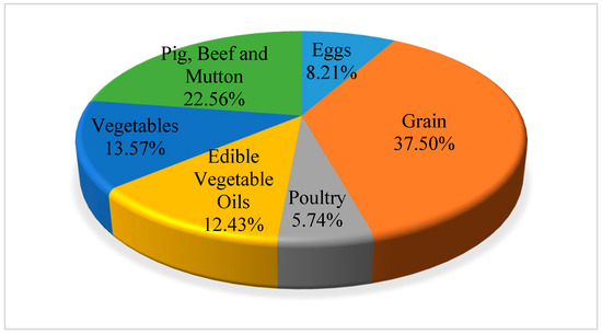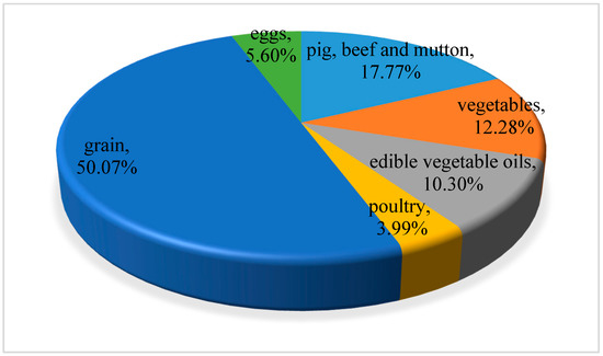 Since 2001, the water footprint of residents on food consumption of grain, vegetables, edible vegetable oil, meat, poultry and eggs has shown an increasing trend, and the increasing range of poultry, meat and eggs is large. Table 3 shows the water footprint of residents’ food consumption divided by food types over the years. From the perspective of food consumption structure, grain and pig, beef and mutton consumption contributed significantly to the water footprint of residents’ food consumption, contributing 37.5% and 22.56% to the total water footprint of food consumption. Vegetables and edible vegetable oils followed, and then followed by the water footprint of eggs and poultry. Based on Table 3, from 2001 to 2016, the proportion of water footprint consumed by each food in China of the total water footprint is shown in Figure 4. Figure 5 and Figure 6 showed the proportion of water footprint consumed by each type of food of urban and rural residents respectively. For urban residents, pig, beef and mutton consumption contributed the most to the total water footprint while grain consumption contributed the most among rural residents.