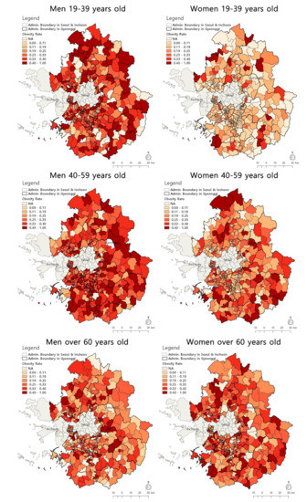 - Jun, H.J.; Namgung, M. Gender Difference and Spatial Heterogeneity in Local Obesity. Int. J. Environ. Res. Public Health 2018, 15, 311. [Google Scholar] [CrossRef]